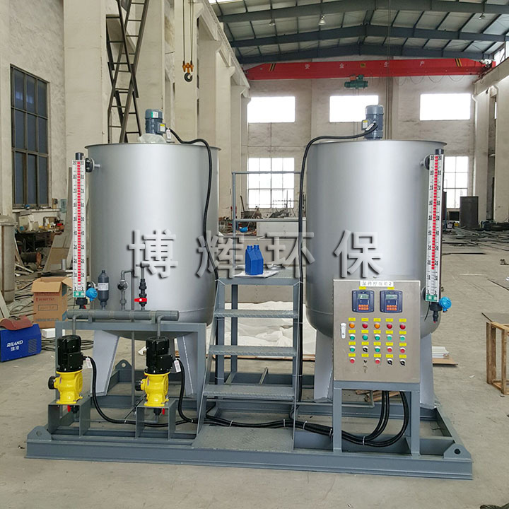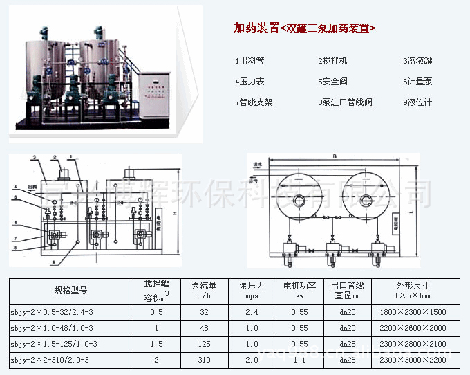 加藥裝置三種型號,都有三大部分組成:1. 攪拌機(jī) 2. 溶液槽 3. 計量裝置及投加設(shè)置。